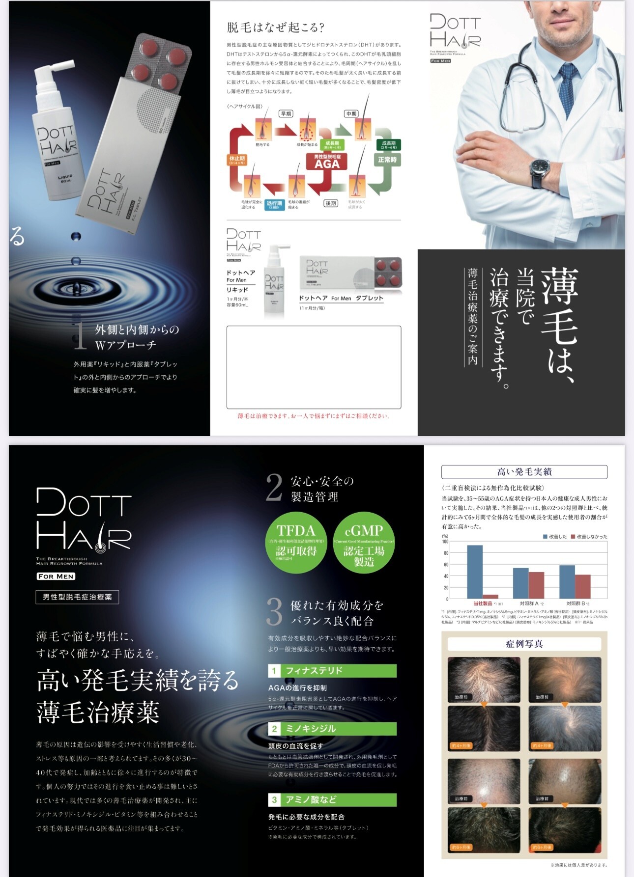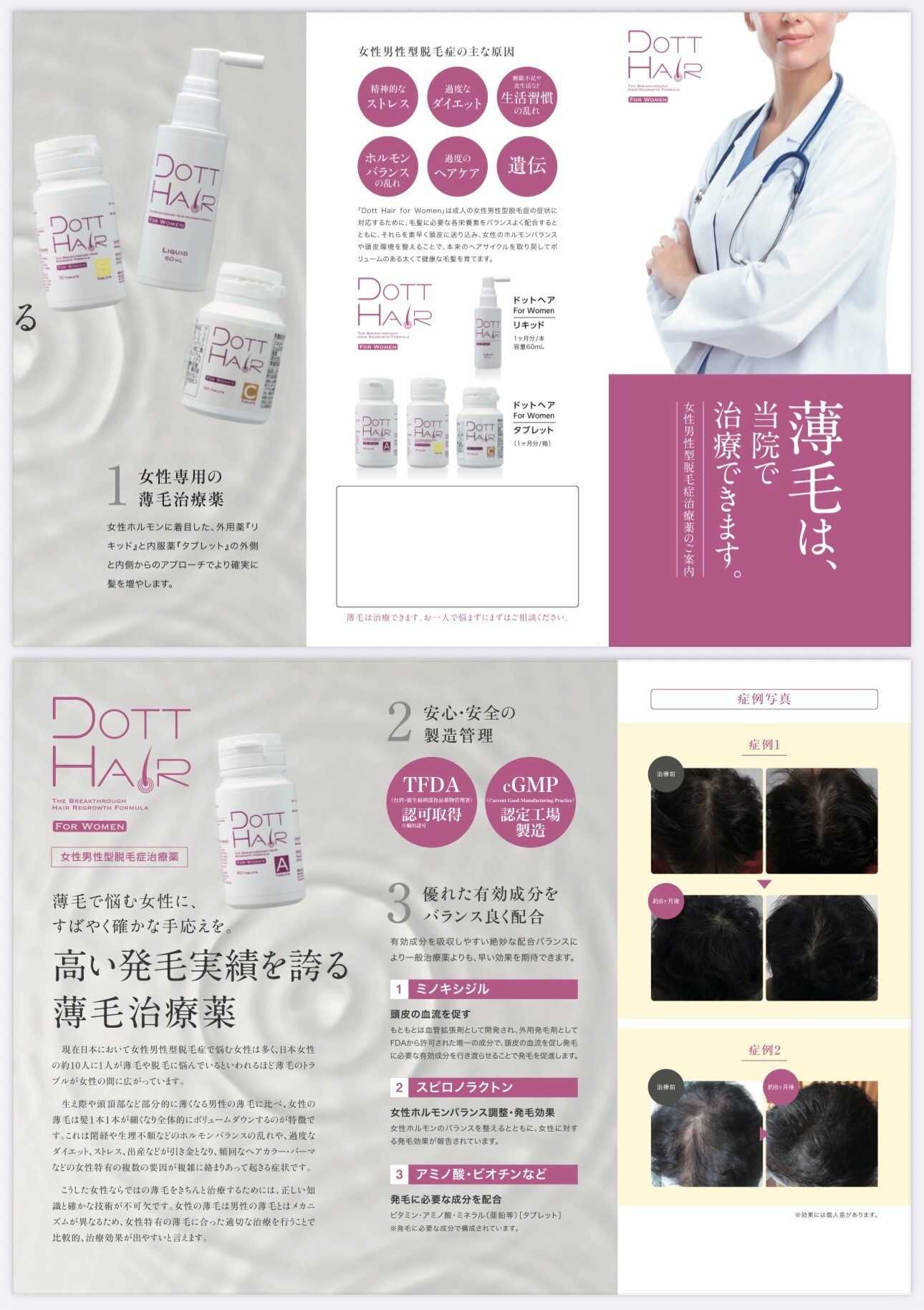 当院ではDott Hair for Womenを採用しています。内服薬と外用薬の2種類を使用することで、一般的な育毛剤よりも効果が期待出来ます。